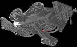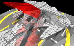 The landing gear was also an experiment: It needed to be flat and give the impression of VTOL (Vertical TakeOff and Landing) capability, without disturbing the design of the engine by looking too massive. With the perforated spacedishes, you were still able to see the design through them. |