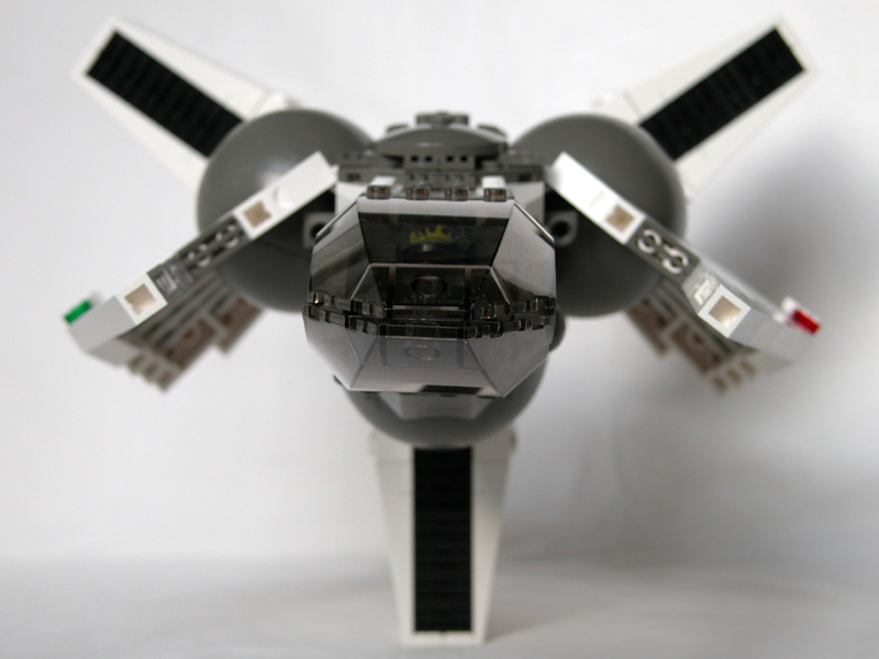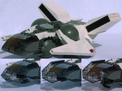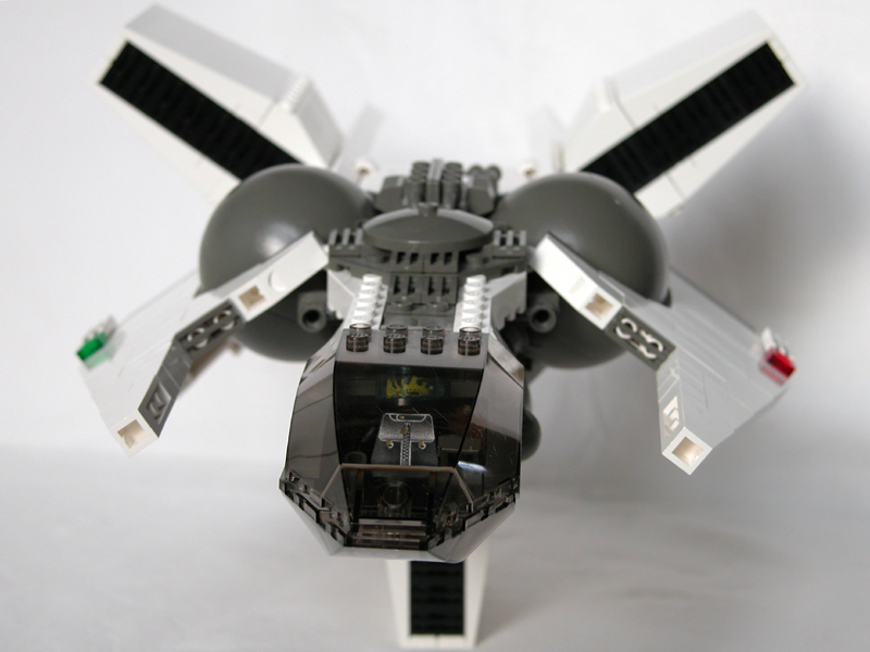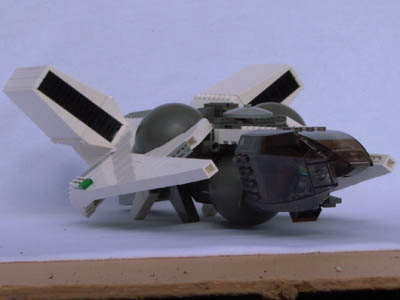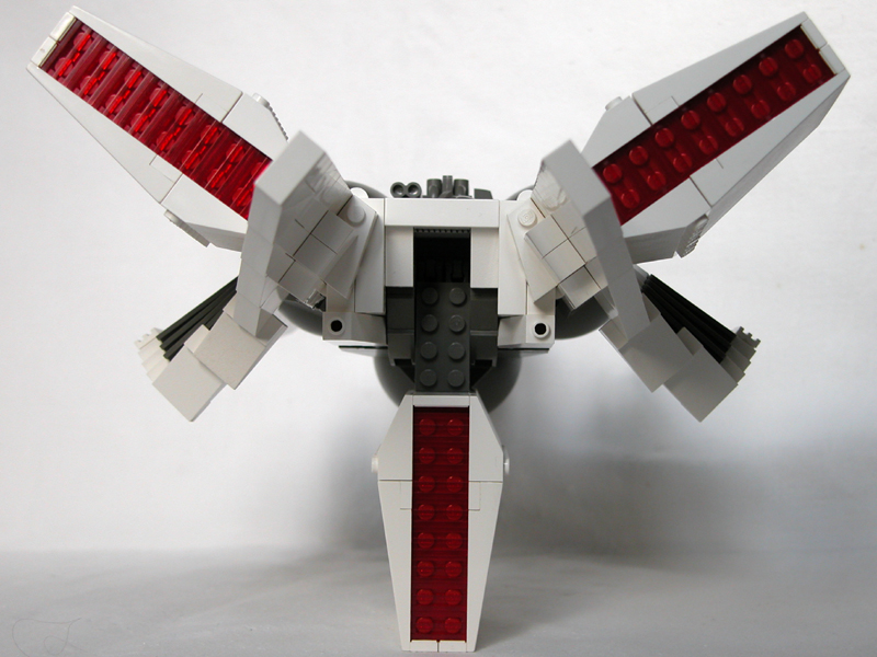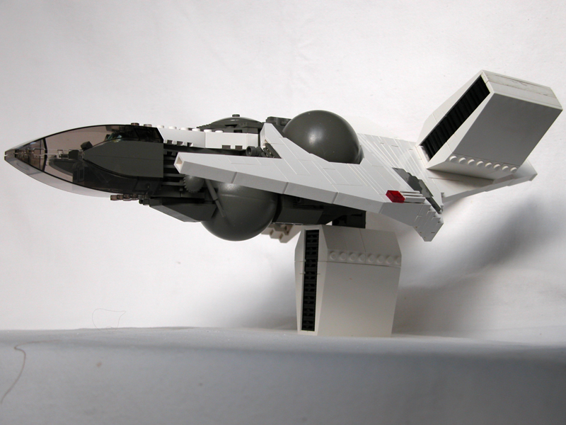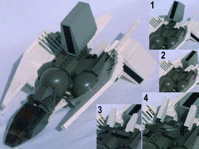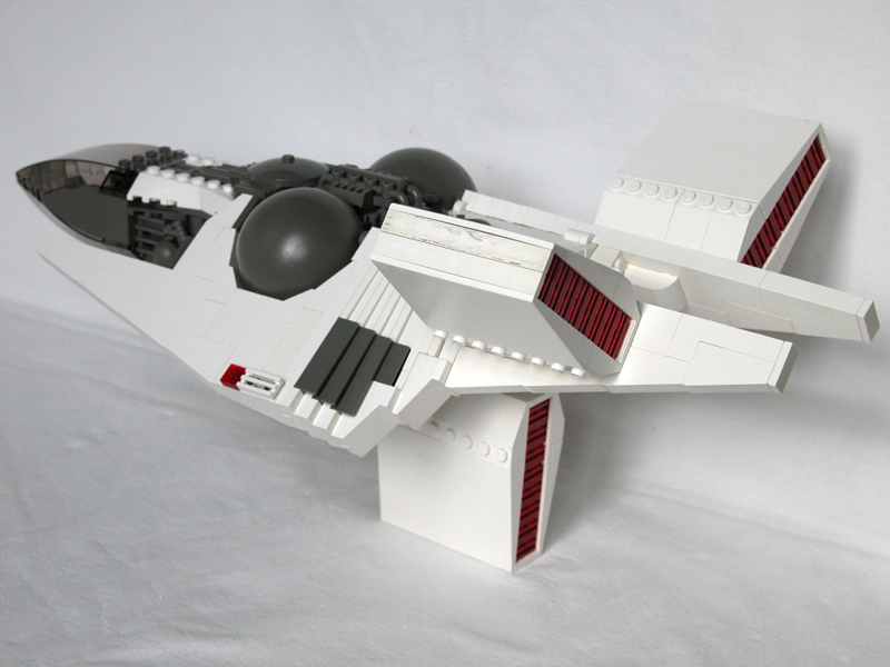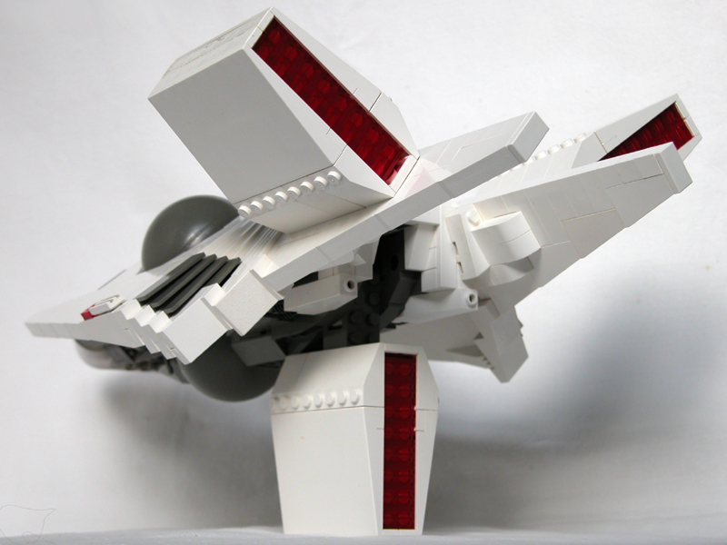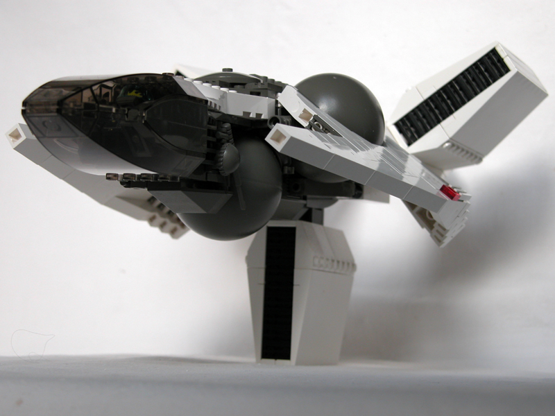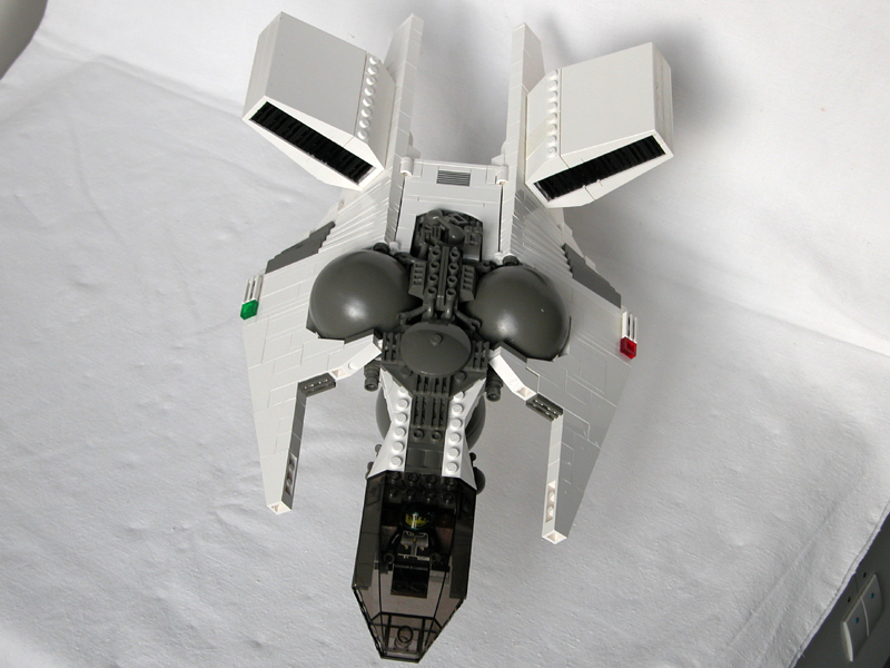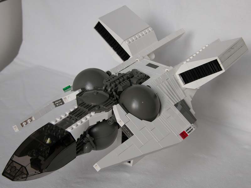 Split tail: So I had the idea to copy the forked tail from my very first serious model, 02, because that would enable me to turn the lower engine backward leaving a pretty flat belly. |