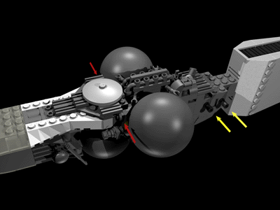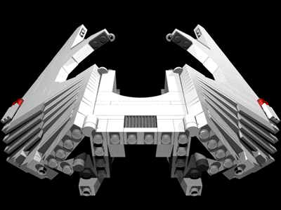 Angling technique: Just a basic jumpertechnique using two hinges. Basically I used the same technique with bricks and hinges as on the 61 Shark2, but unlike that, I kept it simple with a central 90 degree saddle structure that was a lot easier to connect with the internal structure. |