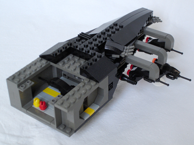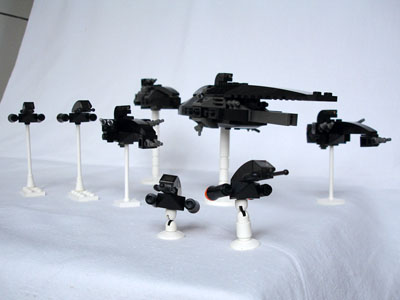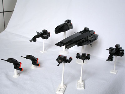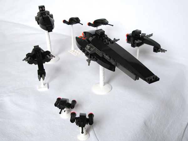 The turrets here are obviously inspired by boxy Star Wars turbolaser-turrets, but besides that, this craft wasn't inspired by anything in particular and one of my absolute favorites of the fleet. The smaller crafts in the fleet are all based on various applications of the 1x1 brick with 5 studs (travis brick). |