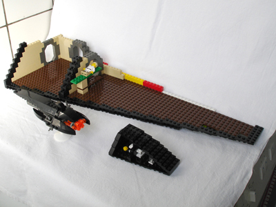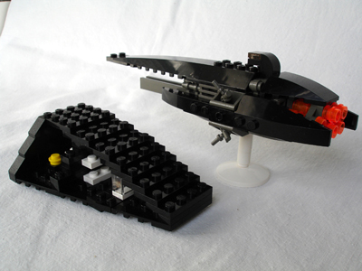 Part of the contest was to create an interiour for the fleet. Having no larger ships, I made a section of a Hangar-Ship with this little repair section. Exteriour shots of fighters hanging by their perches in the pictures below. |